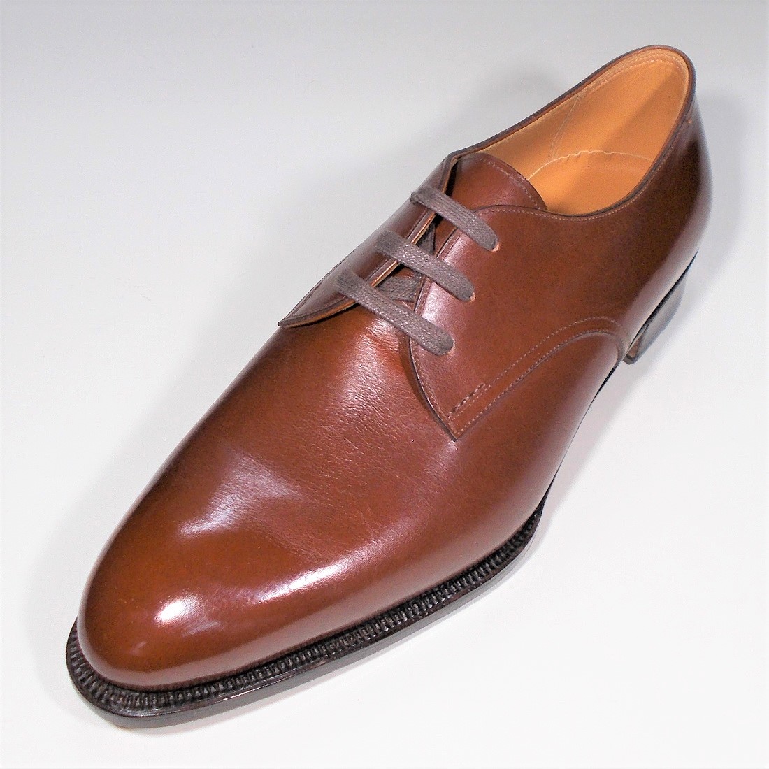 長い間、靴の製作をしていると、デザインの見直しをすることもしばしばあります。質実剛健になりやすい外羽根プレーントゥを、同形にしては目に優しい雰囲気で仕上げてみました。