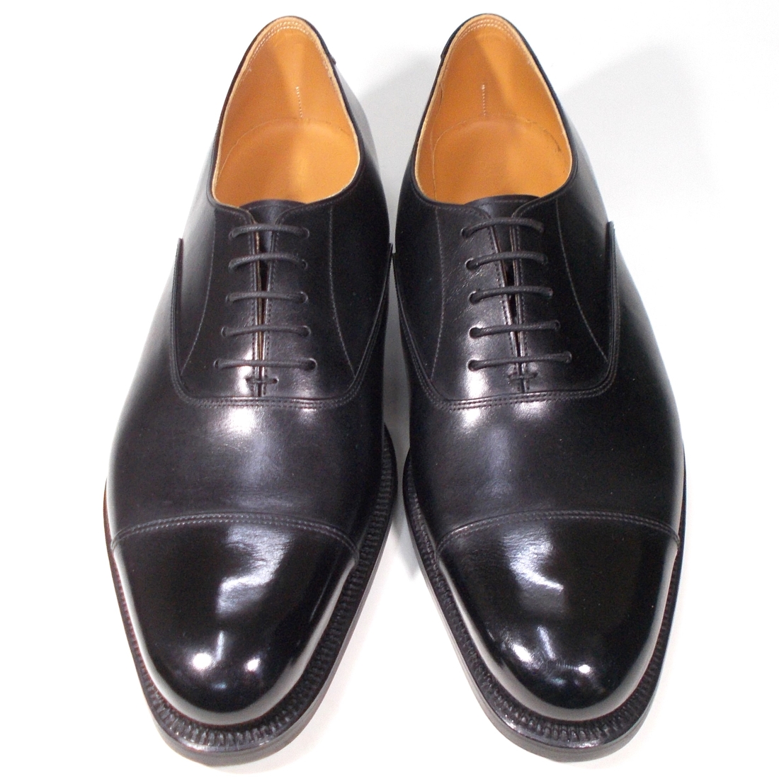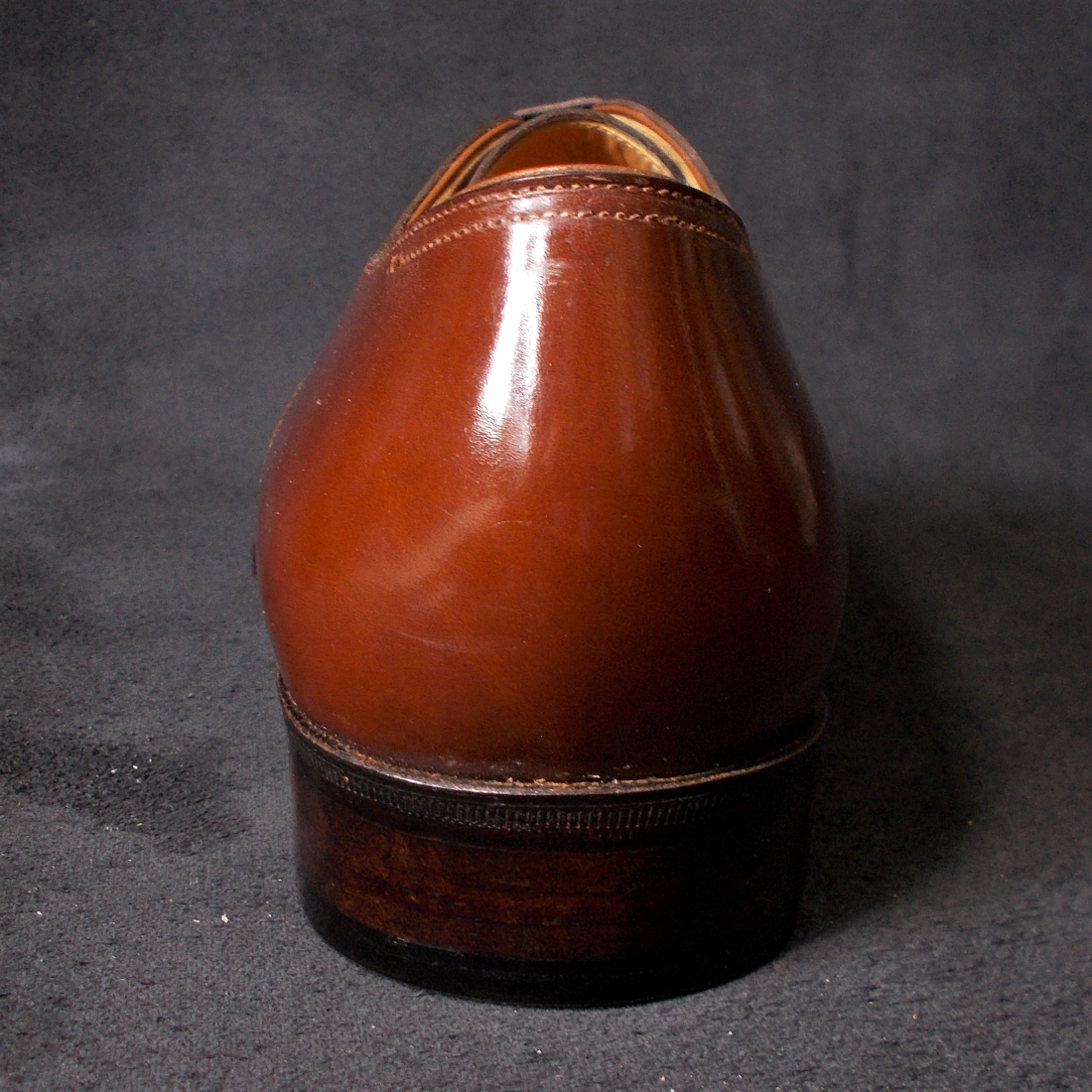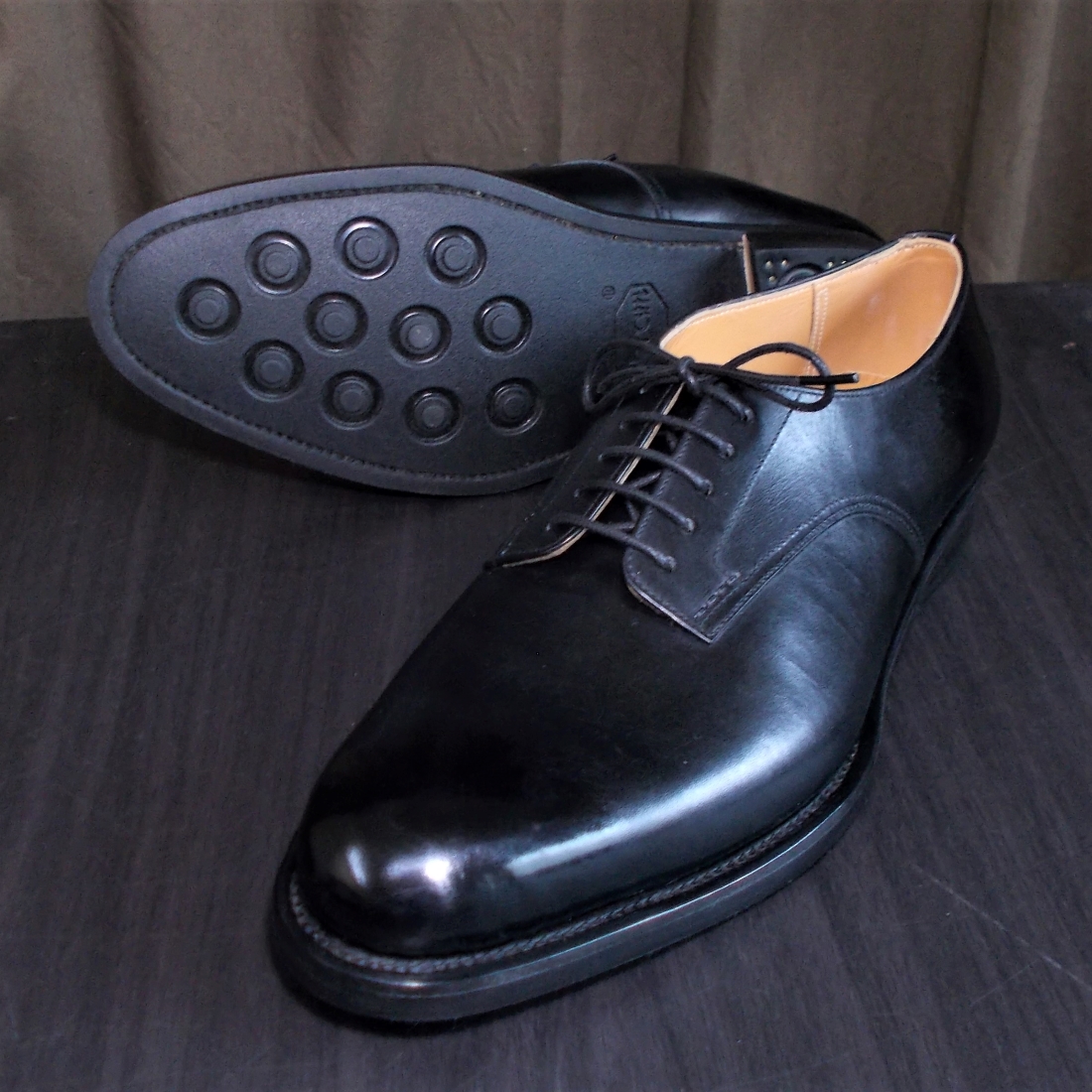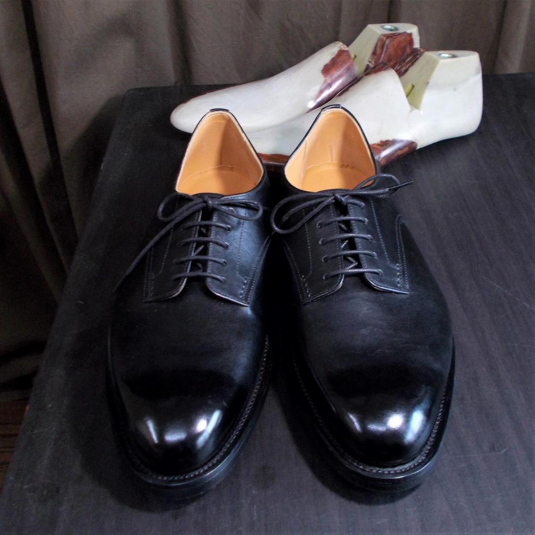 実用一辺倒な外羽根プレーントゥ。ビジネスシーンでは間違いのないデザインです。木型を削ってわざわざ仕立てるのはもったいないかもしれませんが、どうしても足に合う市販品が見つからないのなら、この1足で汎用性は抜群です。
