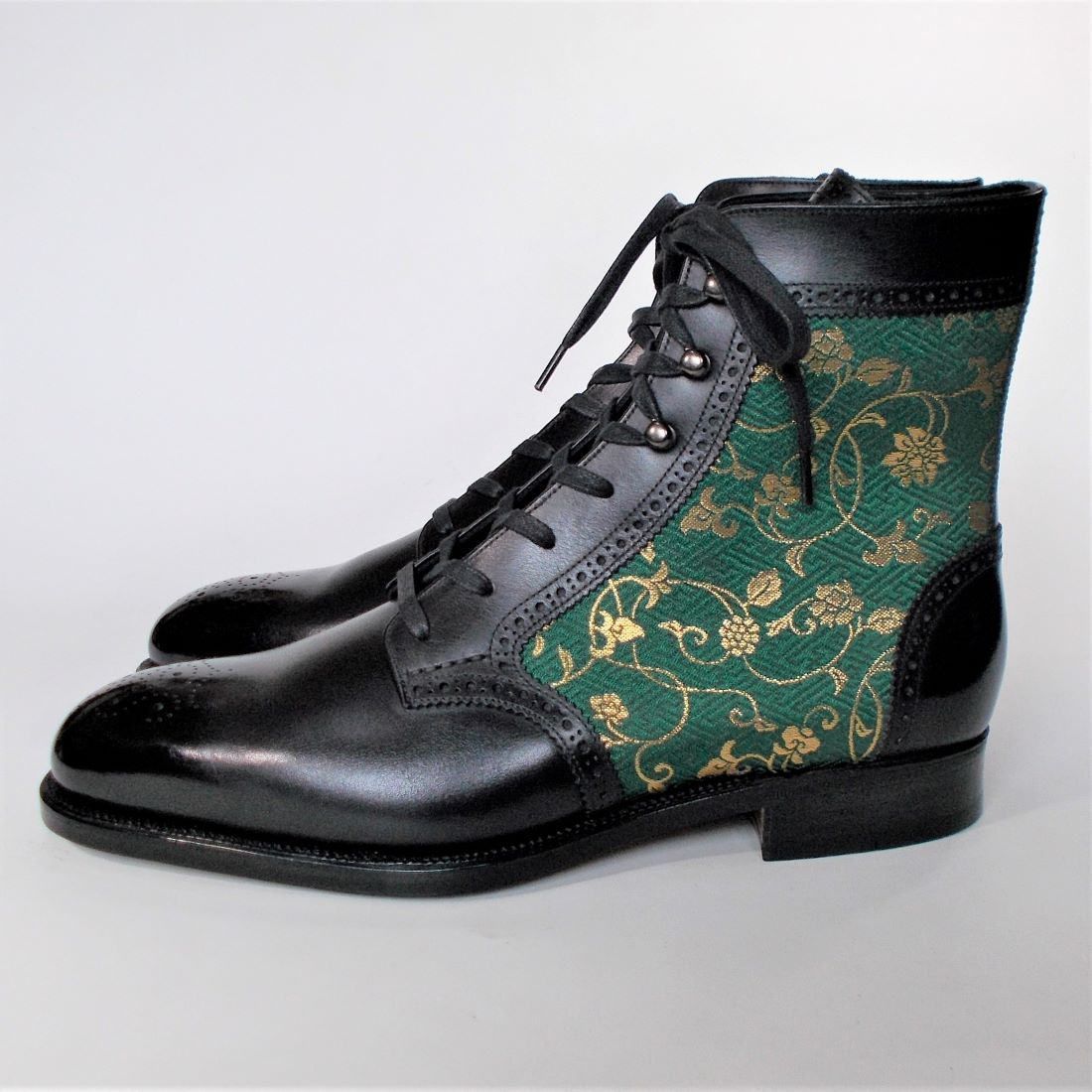 金襴の靴の布地部分を増やして仕立ててみました。サンプルを作るのは封印したつもりでしたが、気分を上げたくなりまして、ついつい、です。