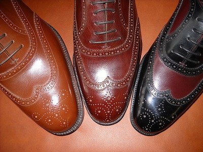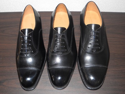 更新が遅くなってますが、以前予告(?)していたパターンオーダー用の木型によるサンプルです。まずはオックスフォードで作りました。左から右に太いように並んでます。細いほうが靴単体では格好良いとは思います。でも、いろんな人の足を見て、靴を仕立てて思うのは、体格と足の形って、ある程度関連があります。足に合わせて靴を仕立てると、上とのバランスも取れていることが多い。そういう雰囲気を感じると、作り手としては快感です。それ以上の快感を履く人が感じてくれる、そう期待しながら作るよう心がけています。