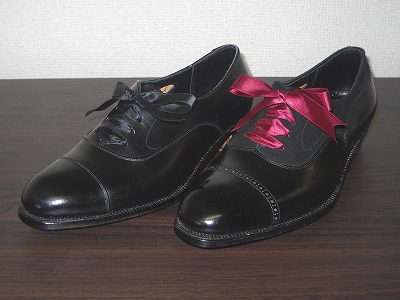 黒のオックスフォードに黒リボンはさすがにフォーマルです。色リボンは・・・上に着るものとセンス次第ですね。こういう洒落はやっぱり内羽根が合いますね。ああ、婦人靴が楽しい。