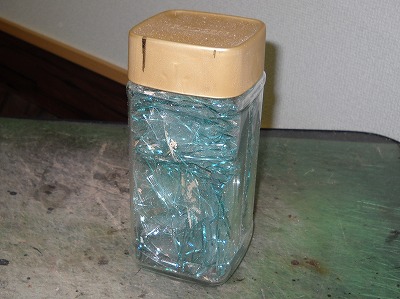 ガラスの刃そのものは脆いです。作り置きすると、刃同士が当たり、刃こぼれを起こして全く使い物になりません。なので、作業の度に新鮮なガラス片を割り、使い捨てにします。ガラスはゴミ箱にポイポイ捨てるわけにもいかないので、とりあえずガラス瓶に集めておくようにしています。最近、ガラス片がコーヒーの瓶いっぱいになりました。靴を作った軌跡です。感謝を込めつつ、これにてまとめて廃棄です。