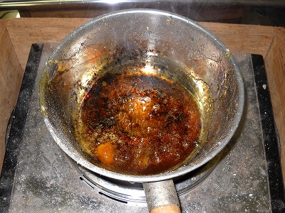 今日の作業を終えると、明日の予定を考えます。縫うぞ、と意気込んだところで、「あ、チャン」。チャンというのは、縫い糸に擦り込む松やにのことです。ここのところ冷え込んだりしたので、前に作ったチャンが風邪をひいてる(使えない状態になっている)だろうとは思っていましたが、案の定・・・でした。劣化しているわけではないので、炊き直します。