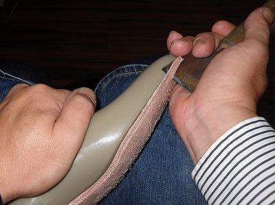 「手製靴」というふれこみで表に出ていると、意外に多いのが、「これも手縫いですか?」と甲革を指差されることです。さすがに30番のナイロン糸を1.5mm弱のピッチで手縫いするのというのは無理なので、製甲はミシン仕事が中心です。