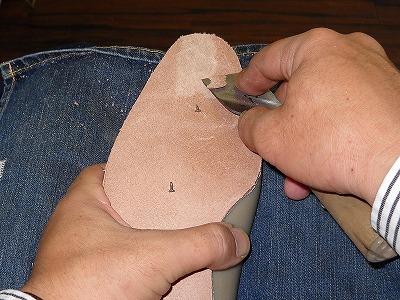 今日は文化の日です。というわけで、朝から文化的(?)に中底加工をしました。前日に木型に合わせてクセ付けしておいたので、包丁をよく砥いだら、中底を切り回すところから始めます。