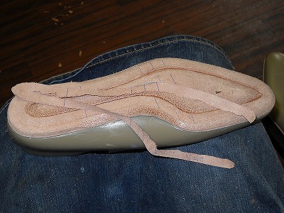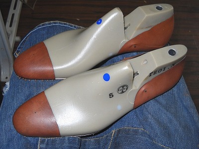 今度は大事に履きたいと思っていたのですが、このテの靴は実用として活躍してくれることもあって、ついつい実験台になってしまいます。それでは、紐をはずして、木型を突っ込んで・・・ いざ、半貼り! 見様見真似シモダ・スペシャル!