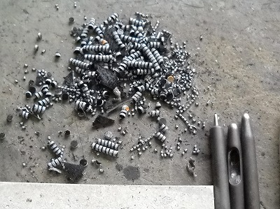 やる気満々の休み明け、今日は朝から2足木型から抜こうと思ったら、いきなりバチィィィィィィン。同業者さんには分かるけれど、の、木型抜きのピンです。鋼鉄製なので、派手に割れるものです。こういうときはまず靴本体の心配をしますが、今回のはビスポークのお試しだったので、その点はホッと一安心でした。ヒールを小さく作ることが多いので、ビスポーク靴では特にあり得るんですね。何年ぶりだろう、以前はどの木型でやったっけ、などと思いながら、予備が手元にないことは分かっていたので、朝一番から予定変更の憂き目に遭いました。