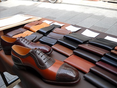 そろそろ閉店の雰囲気が流れ出す頃、大柄な外国の方が目の前に立っていました。私はイングリッシュがとってもプアなので、話しかけられたらどうしようと思っていました。果たして、目が合い、きっちり歩み寄ってきました。「お前は何をメインに作ってるんだ」「靴だ」とか、やさしい英語と貧相な英語で2、3会話を交わすと、彼は展示していた靴を手に取りました。持ち替え持ち替えしながら、3Dに靴を眺め回しました。向こうの方は本当に作りを見ます。日本人とは異なる、また、職人とも異なる靴の見方に触れるのは、新鮮な経験です。おもむろに、