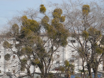 写真は近所で見つけたてんこ盛りのヤドリギです。中書島近辺は、京阪電鉄の車窓からも見られるぐらい、ヤドリギが多いです。それにしても、これだけ密集しているのを初めて目にしたときは、驚きのあまり自転車で転びそうになりました。