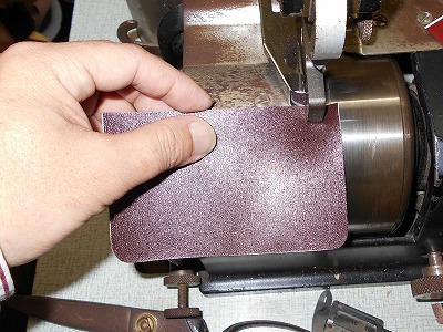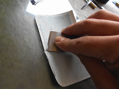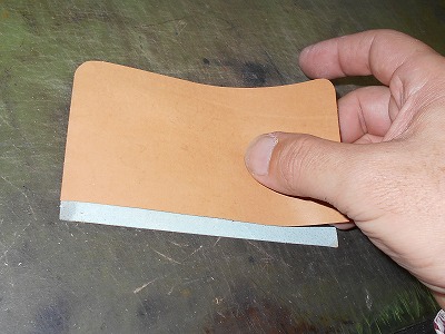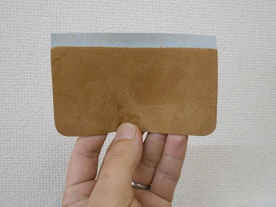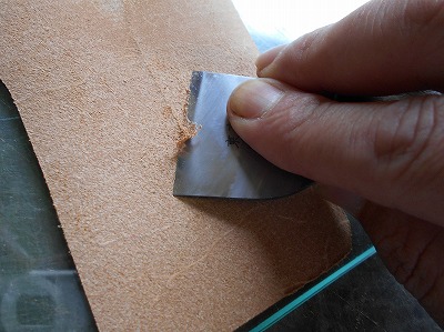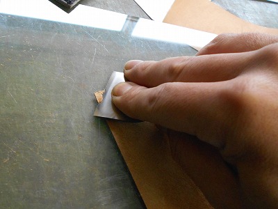 折り返して糊付けする部分の銀面を、紙やすりで荒らしておきます。革の銀面は組織が緻密なので、糊が利きませんから。