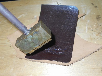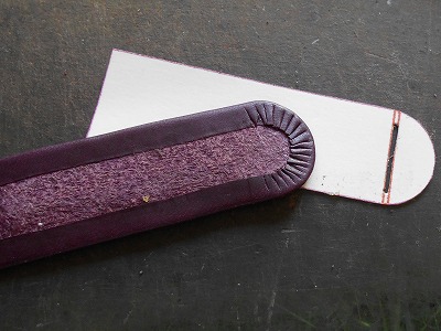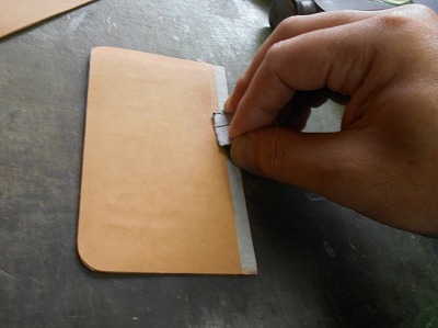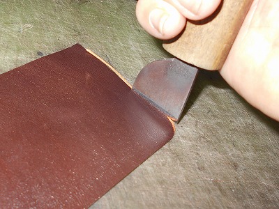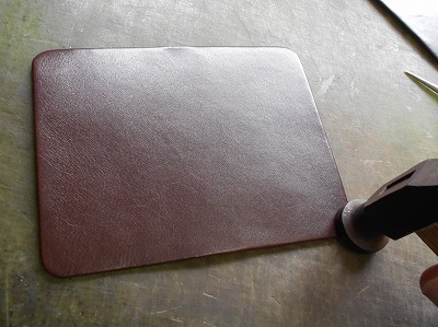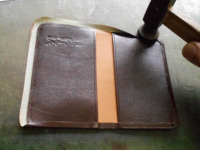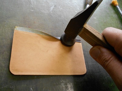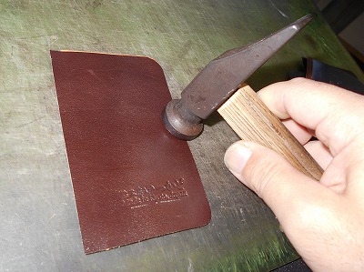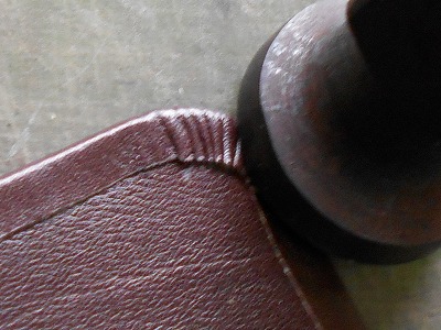 糊が乾いたら、折り返して、ハンマーで叩いて圧着します。クロムなめしの革は床面が青白い不自然な色なので、切り目を隠したいことと、端を銀面で覆うことで強度/耐久性を求めます。
