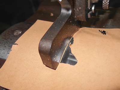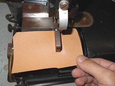 裏革は漉いてから型入れします。先に漉いておくのは、柔らかい革なので、機械で細工しにくいからです。