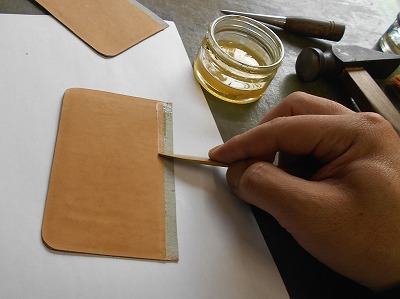 改めて張り込んだ部分を叩いて、確実に仮止めしておきます。パーツがずれたまま縫製してしまうと、取り返しがつきません。革に穴を開けてしまうと、元には戻らないのです。