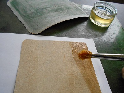 糊を薄く塗ります。銀面を糊付けするので、ベタ貼りに使った糊よりもよく着くものを使います。粘り気があるので、竹ベラ(自作)が便利です。