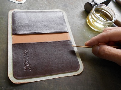 カード挿しのポケット裏にも、裏革を仕込みます。見えないところにも裏地を・・・・強度や手応えのためですが、靴屋の癖みたいなものです。床面がむき出しになっている仕様には、いつまで経っても馴染めないのです。