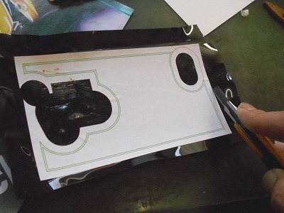 型入れの図。あらかじめ世の中の全機種に合う型紙を用意できるはずもありません。注文ごと、機種ごとに型紙を作ります。曲げたプラ板の凹面に型紙を仮止めして、型入れします。凸面では押さえが利かず、切ることはできません。
