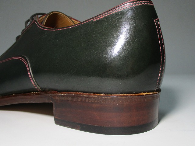 ビスポーク靴らしく、少しだけ技を投入。緑色の革に黒のクリームで色を入れてみました。